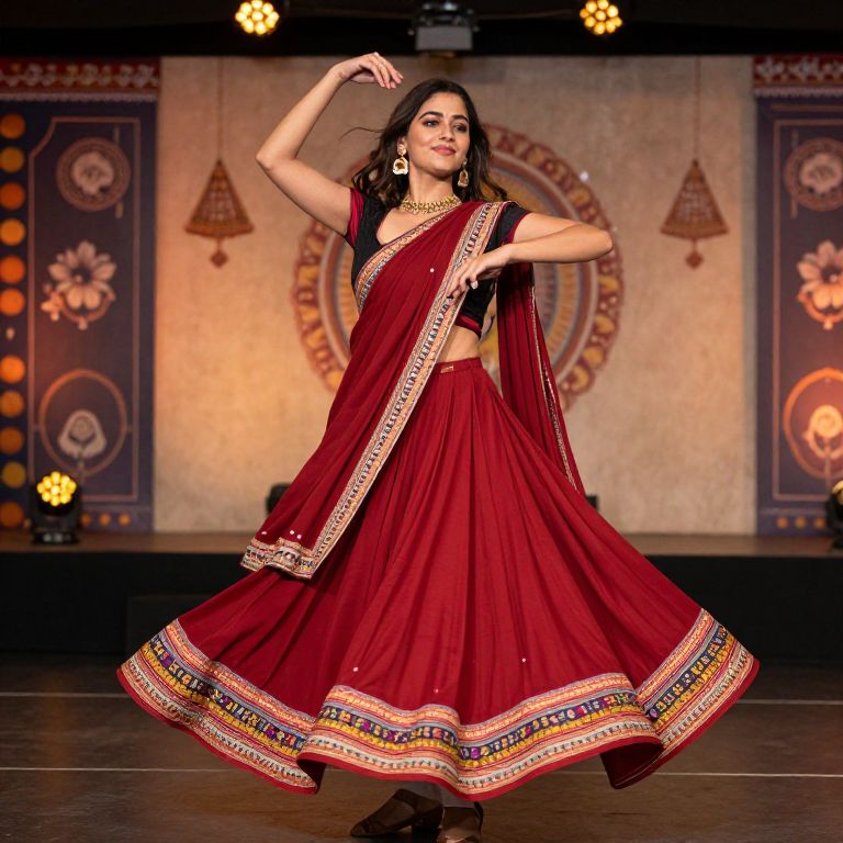 A stylish female in a modern-inspired dandiya dress, dancing dynamically in a contemporary performance during a fusion cultural event at a city arts center, her face lit with confidence and passion, wearing a red sari-like fabric with vibrant border details, standing in front of a backdrop of Indian motifs and lights