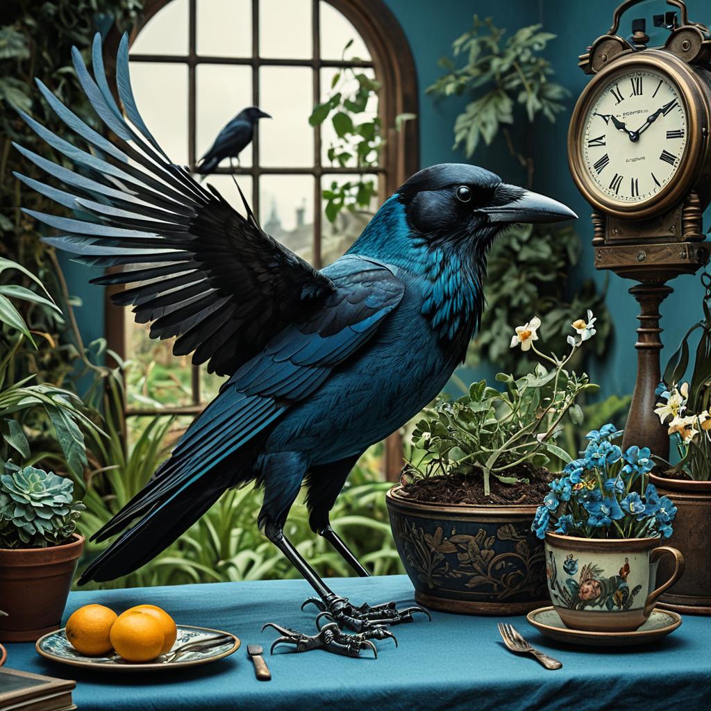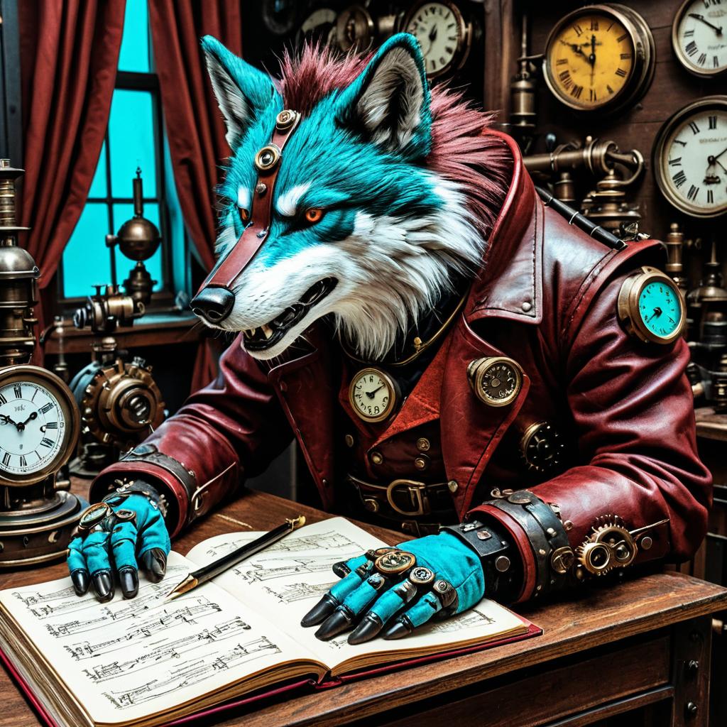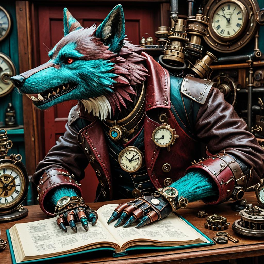 Detailed illustration of a crimson gearwolf with articulated joints and electric cyan fur reading an open diary. The gearwolf wears a red leather jacket with steampunk clockpunk accessories, including multiple antique clocks and mechanical elements. The setting features various vintage clocks and intricate machinery, highlighting a clockpunk rebellion theme with trompe-lœil illusionistic details.
