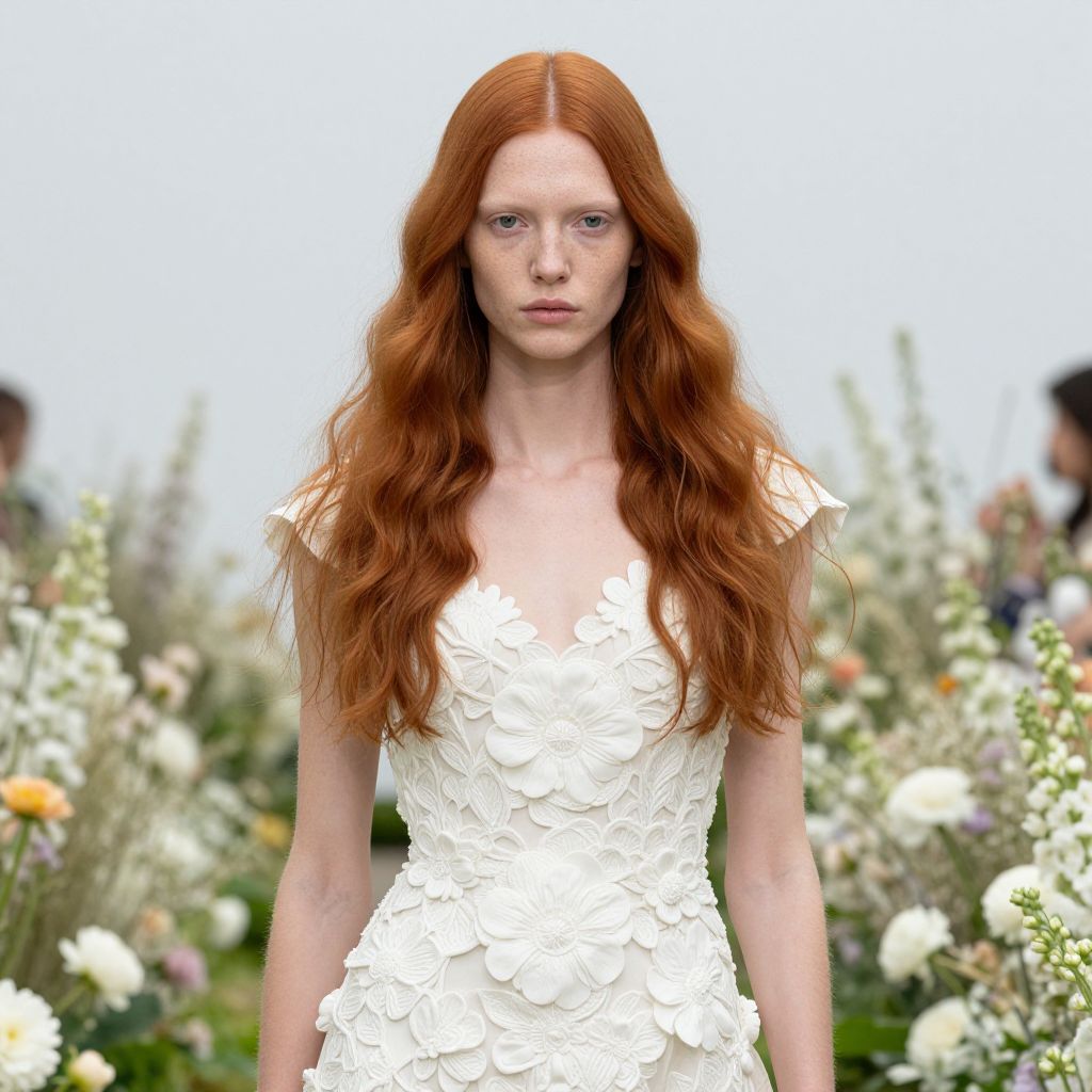 The image depicts a striking fashion photograph by Mario Testino, featuring a red-haired model with a realistic face and intricate skin texture, standing in a modern, minimalistic flower garden. The model is adorned in a detailed, white couture dress with elaborate floral patterns, standing amidst a lush array of white and pastel flowers. The composition is balanced, with the model's face and hair being the focal points, surrounded by the delicate textures and vibrant colors of the flowers. The overall scene is a harmonious blend of natural and fashion elements, capturing the essence of contemporary fashion photography.