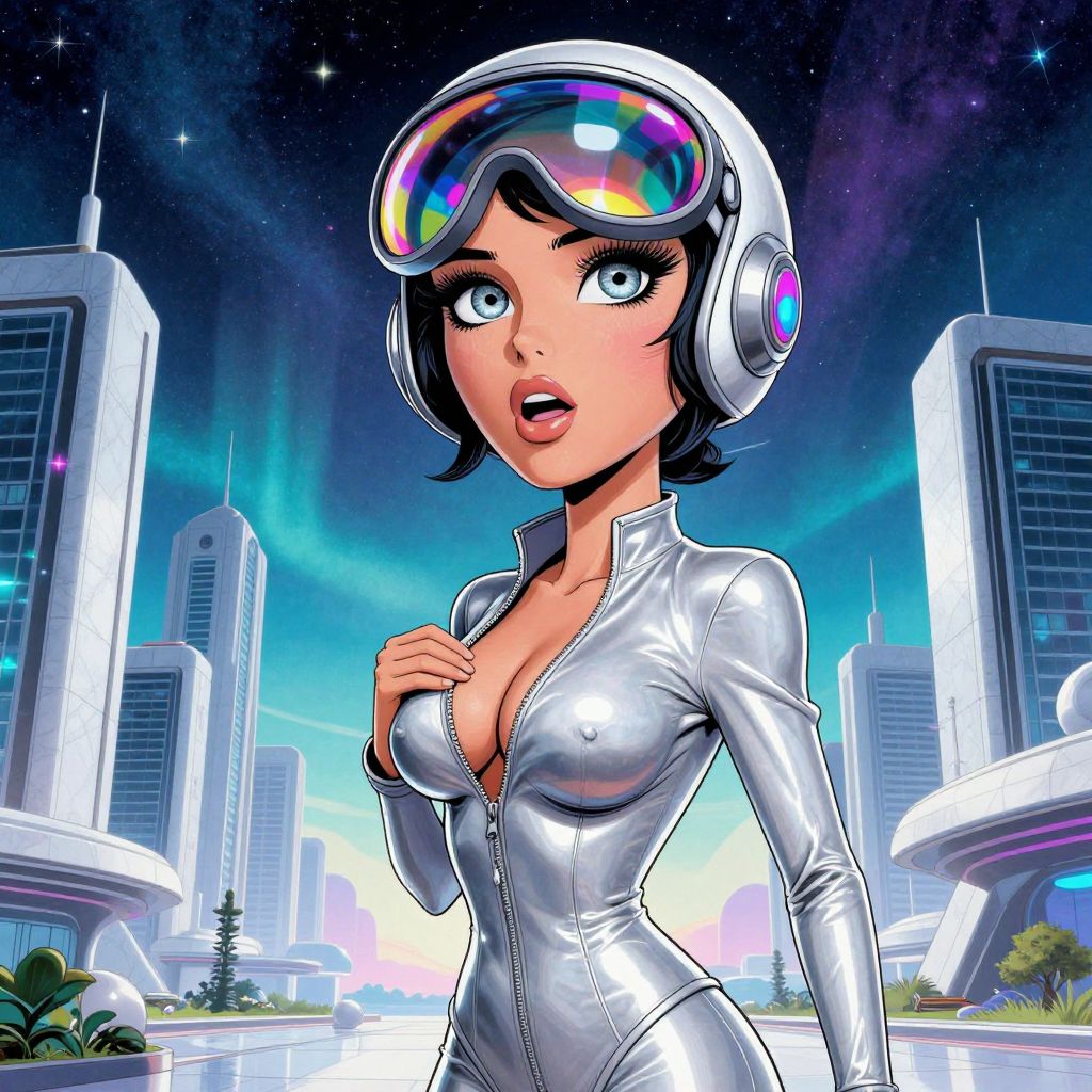 A futuristic, sci-fi painting features a woman in a retro futuristic outfit, with a disco ball, confetti, and a mirror reflecting a starry sky and another woman in a polka-dotted dress.