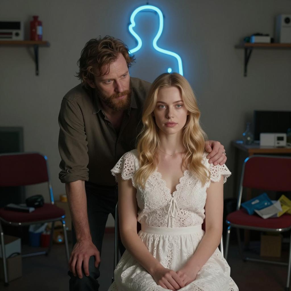 Two people in a dimly lit, cluttered room. A woman with fair skin, blonde hair, and wearing a white lace dress sits in the foreground. A man with fair skin, beard, and brown shirt leans behind her. Neon blue outline of a person glows in the background. Red chairs and scattered objects surround them. The man's hand rests on her shoulder.