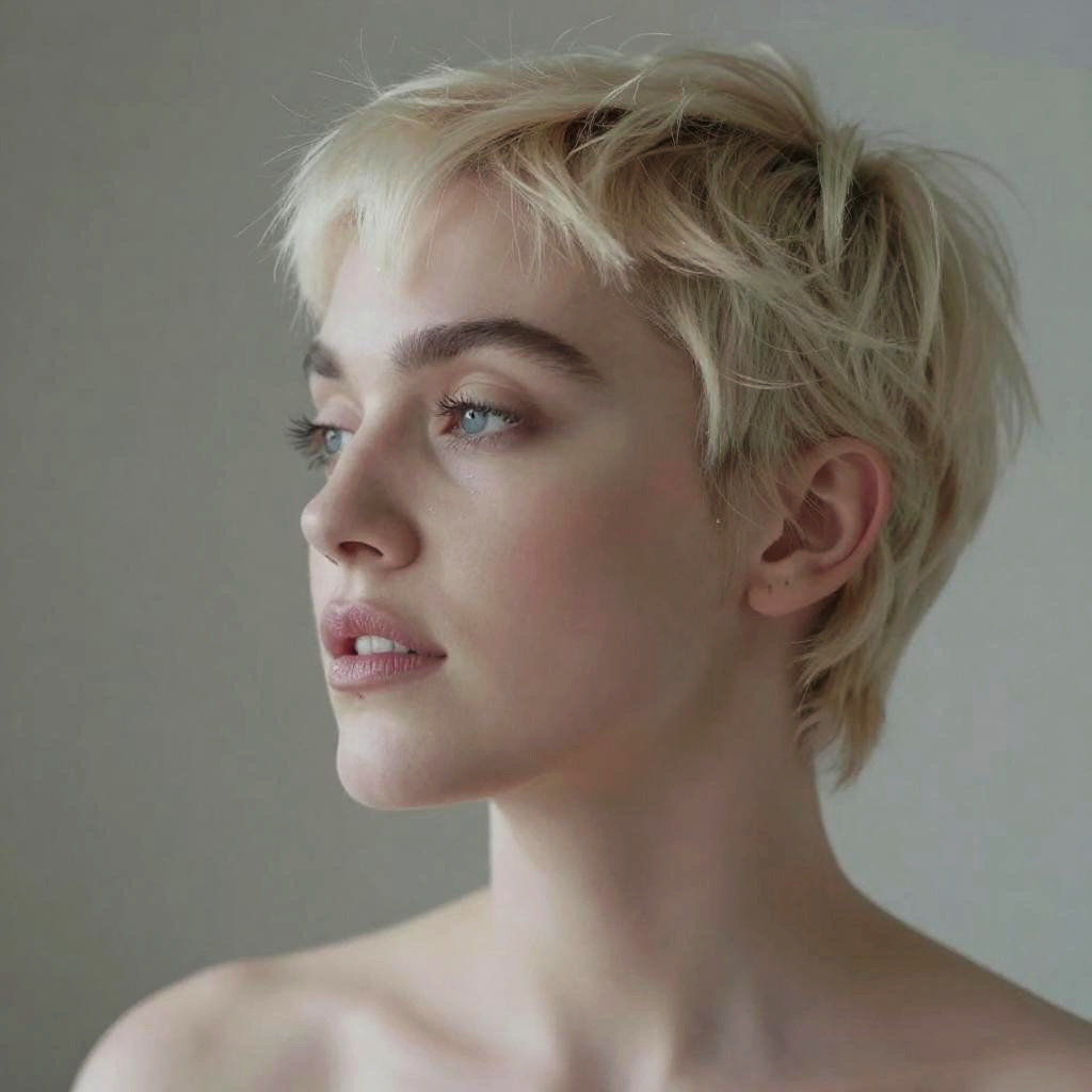 Pixie madonna short hair, ethereal portrait of a serene woman with delicate pixie hairstyle, luminous skin, dreamy atmosphere, soft focus, inspired by 80s Madonna aesthetics