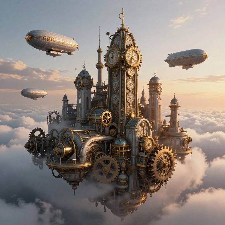 A fantastical steampunk scene featuring intricate mechanical birds and a floating clock tower with copper and brass elements. The landscape showcases imaginative flying contraptions with gears and vintage clockwork details set against a serene sky and rolling green hills.
