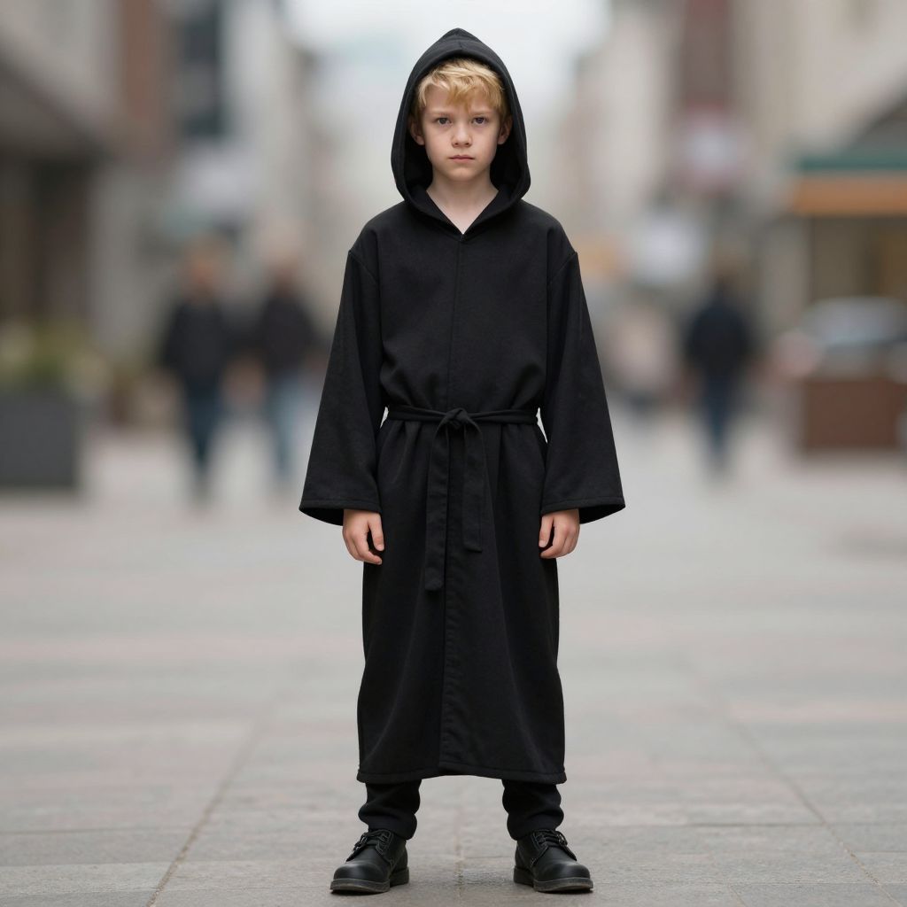 Photograph of a young blonde boy standing in a blurred urban street. He wears a long, black, hooded robe with a belt tied at the waist, black pants, and black shoes. The hood is up, partially obscuring his hair. His expression is neutral, and he stands with his hands by his sides. The background shows a street with indistinct buildings and a few blurred pedestrians. The sky is overcast, and the street is paved with gray tiles. The overall mood is somber and slightly mysterious.