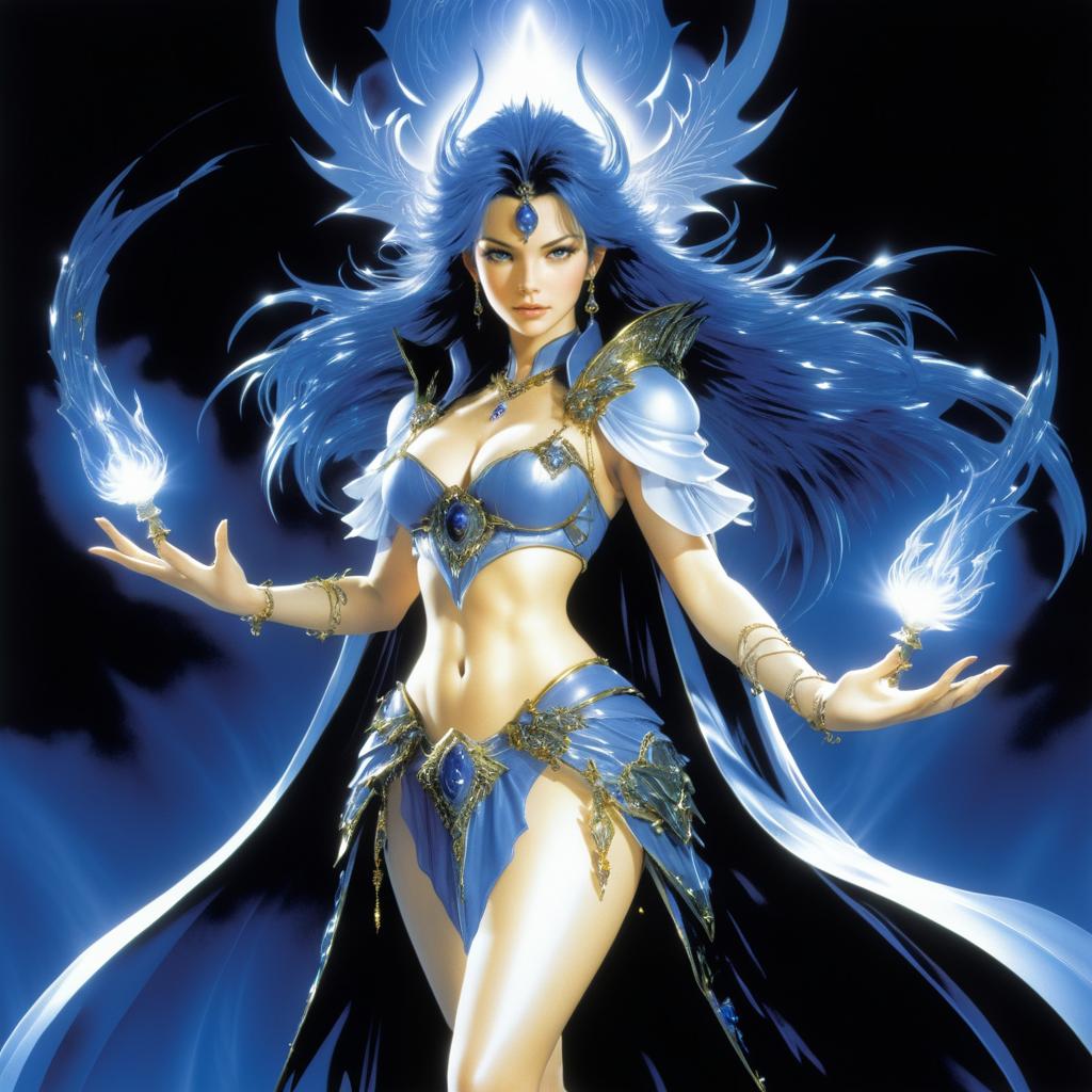 Fantasy character illustration of a sorceress in Final Fantasy by Yoshitaka Amano, styled with cinematic lighting and high detail.