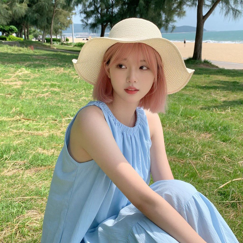 Tropicalblondegirl sitting on a hammock between two coconut palms, wearing a light breezy outfit, holding a fresh coconut drink with a tiny umbrella, backdrop of crystal-clear ocean and bright blue sky, soft tropical breeze and gentle sunlight illuminating her relaxed smile.