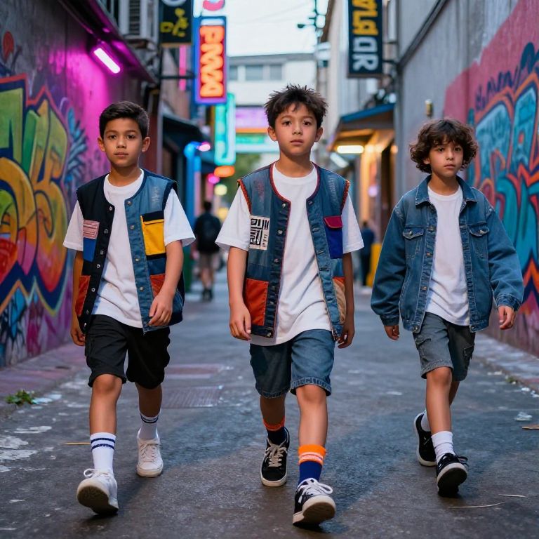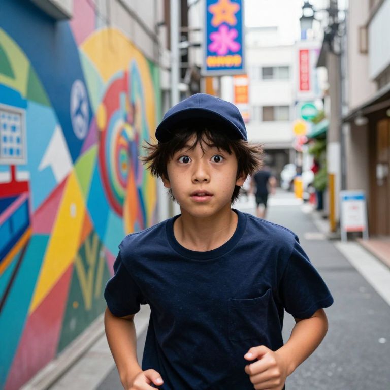 Photograph of an Asian boy with short, messy black hair, wearing a navy blue cap and matching t-shirt, running down a narrow urban alley. His wide, surprised eyes and slightly open mouth convey a sense of alarm or curiosity. The alley is colorful, with vibrant graffiti on the left wall and neon signs in the background. The right side features a brown building with a small white table. The alley is slightly blurred, emphasizing the boy as the focal point. The overall scene is bright with a mix of urban and artistic elements.