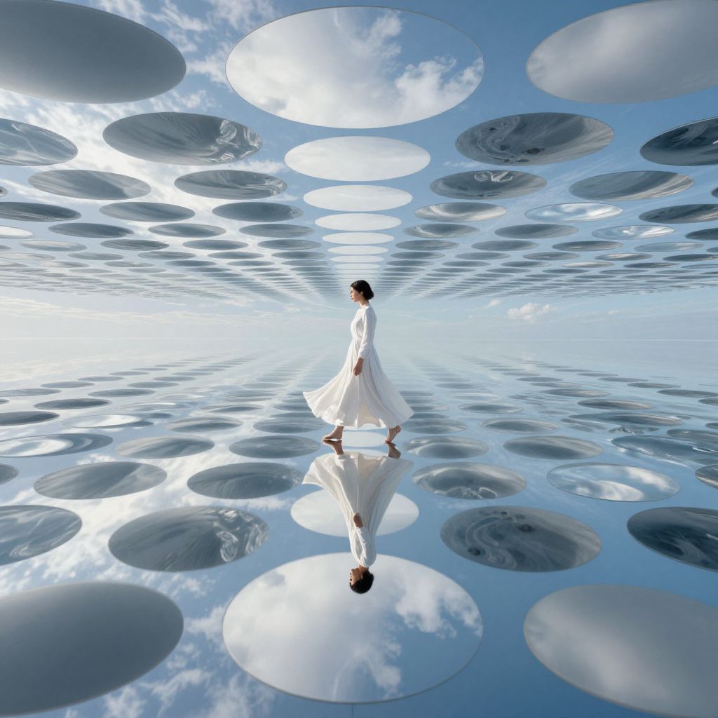A woman in flowing white walks across a surreal expanse where the ground mirrors the sky in countless perfect circles, creating an endless, dreamlike reflection of light and shadow.