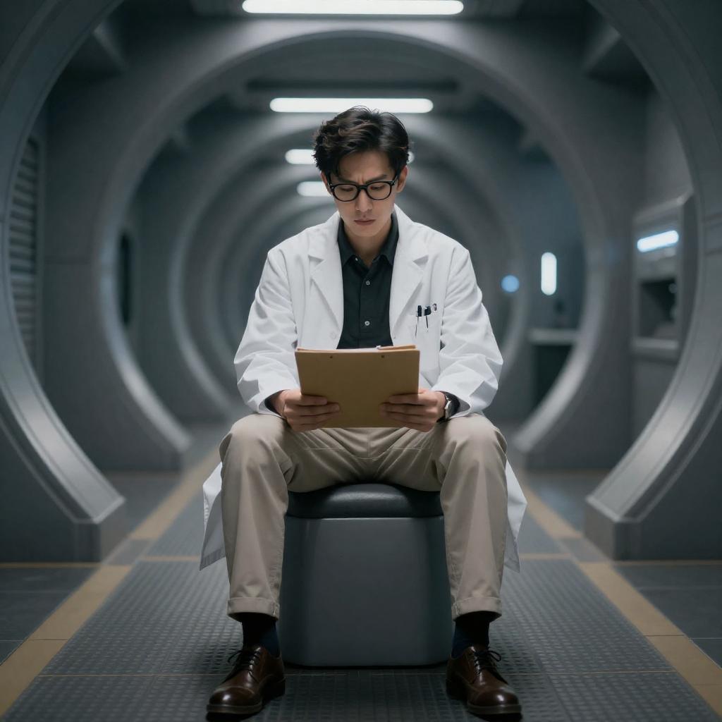 Man with glasses, white lab coat, black vest, and beige pants, sits in a futuristic metallic tunnel. He holds a folder, with a light source behind him. Tunnel has circular rings and a checkered floor. Intense expression. One person.