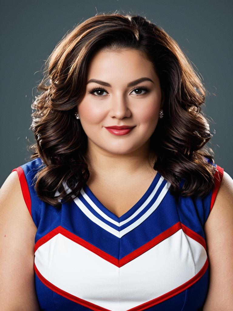 Woman in Plus Size Cheerleader costume, photorealistic detailed headshot