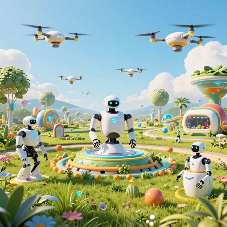 A vibrant CGI digital artwork depicts a sunny, futuristic outdoor scene with four white, humanoid robots with black accents and blue eyes standing on a colorful, circular platform in the center. The robots have sleek, metallic bodies and are surrounded by lush green grass, colorful flowers, and scattered orange spheres. In the background, various whimsical, dome-shaped structures with pastel colors and circular windows are scattered, alongside flying drones with propellers in the bright blue sky. Trees and distant mountains complete the idyllic landscape, creating a blend of nature and futuristic technology.