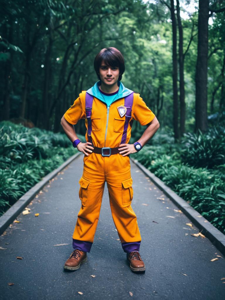 Young man dressed in a detailed Dora the Explorer cosplay costume featuring an orange jumpsuit with purple accents, standing confidently on a paved path surrounded by green forest vegetation. The cosplay includes brown boots, a purple watch, and backpack straps. The setting is an outdoor wooded area with lush trees and greenery.