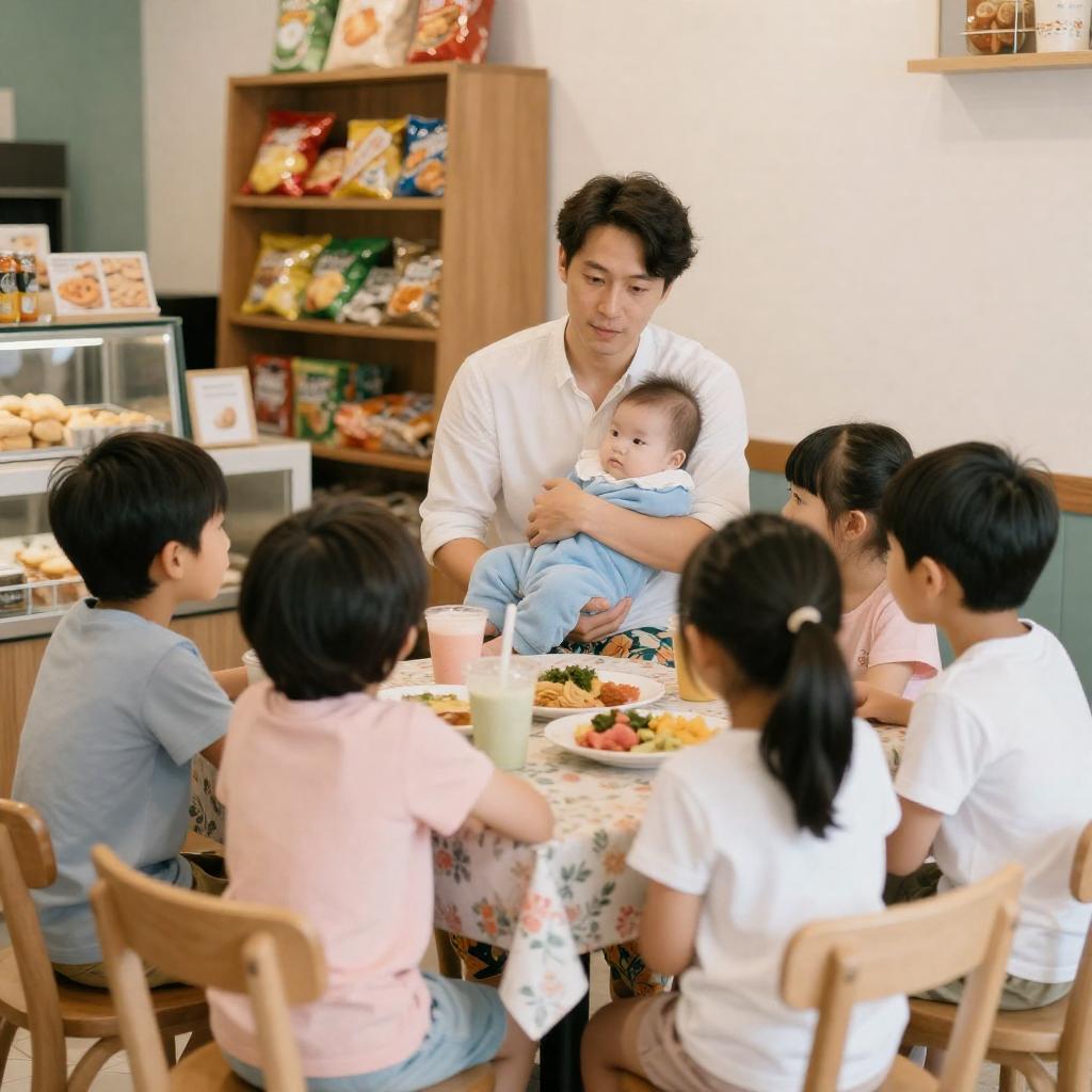 Photograph of a small café. Asian man with short dark hair, wearing a white shirt and floral pants, holds a baby in a blue blanket. Four children with varied hair colors sit at a table, facing him. Table has food, drinks, and a floral tablecloth. Shelves in background hold snacks. Warm, colorful interior.