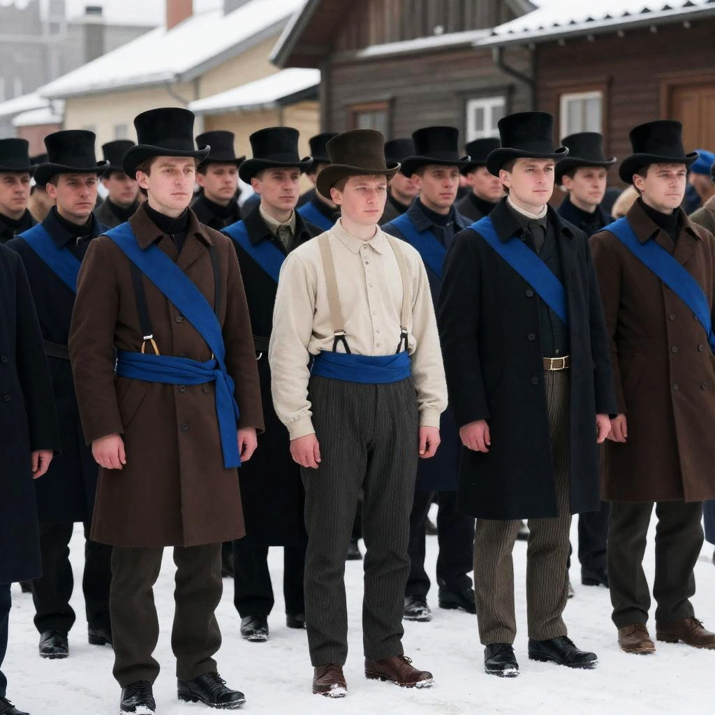 Photograph of a large group of men in 19th-century attire, standing in a snowy street. They wear black top hats, brown and beige shirts, suspenders, and blue sashes. Some have long coats, others striped pants. Background shows more people and wooden buildings. Faces show neutral expressions. Snow covers the ground.