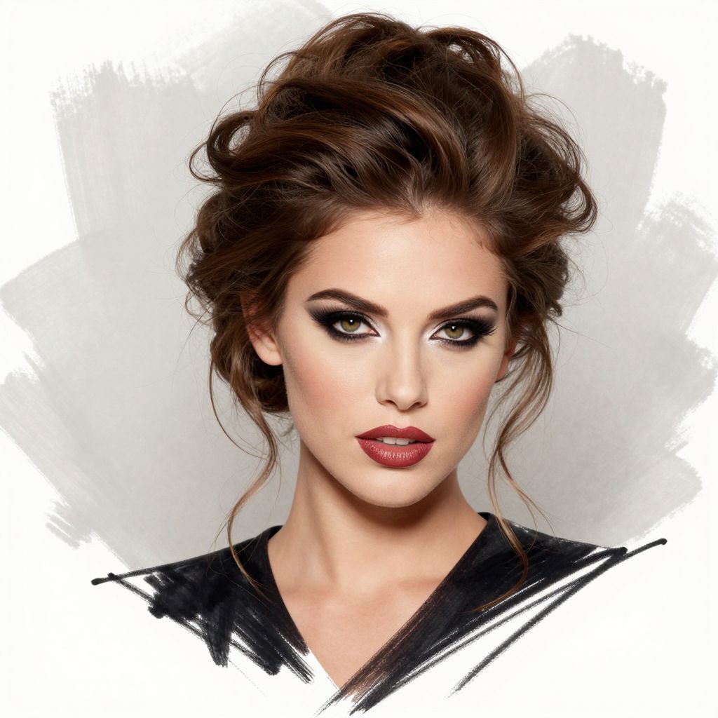 Fashion illustrator Kelly Smith captures a striking portrait of a woman with voluminous brown hair styled in an elegant updo, accentuating her bold makeup and confident expression, set against a minimalist background.