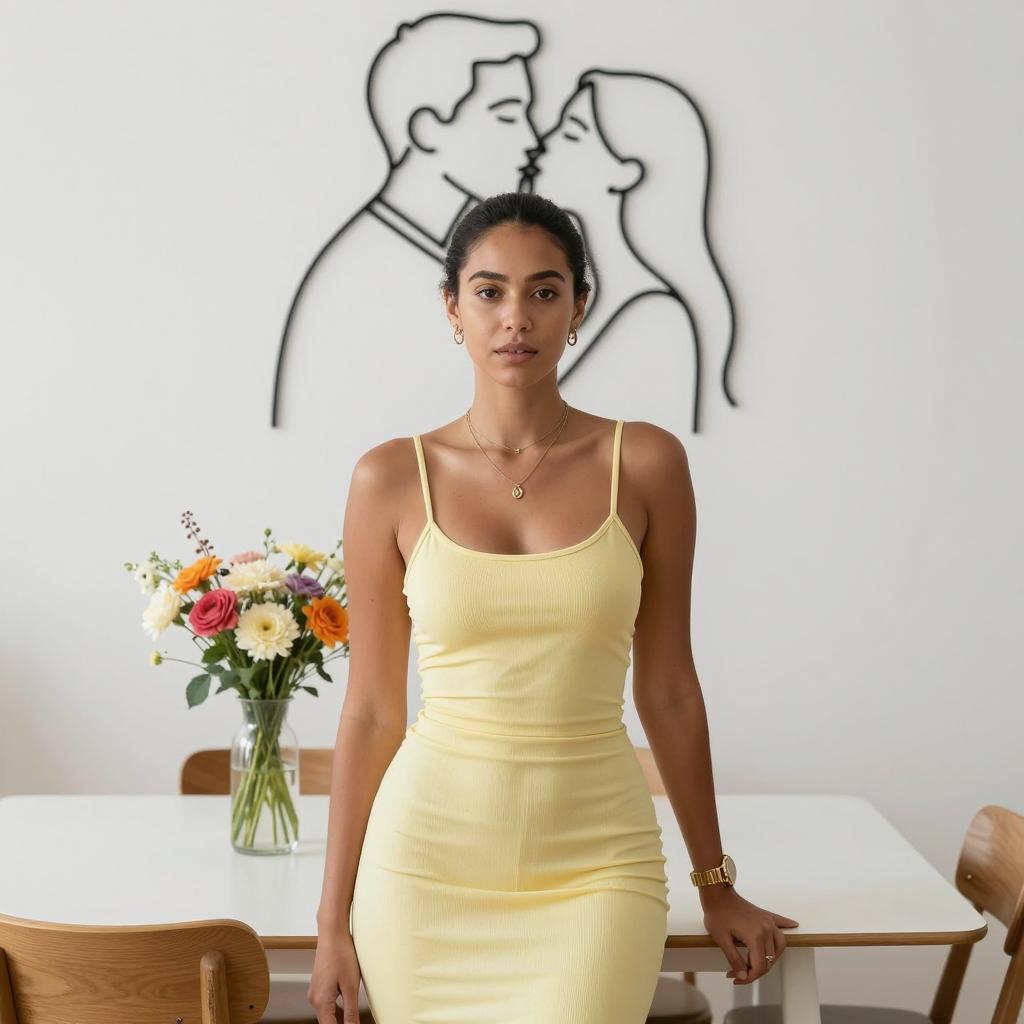 Photograph of a woman with light brown skin, dark hair in a bun, wearing a tight, pale yellow spaghetti-strap dress, standing in front of a minimalistic line drawing of two kissing people on a white wall. She has a neutral expression, wearing multiple necklaces and a gold watch. A vase with colorful flowers is on a white table to her left, and a wooden chair is in the bottom left corner.