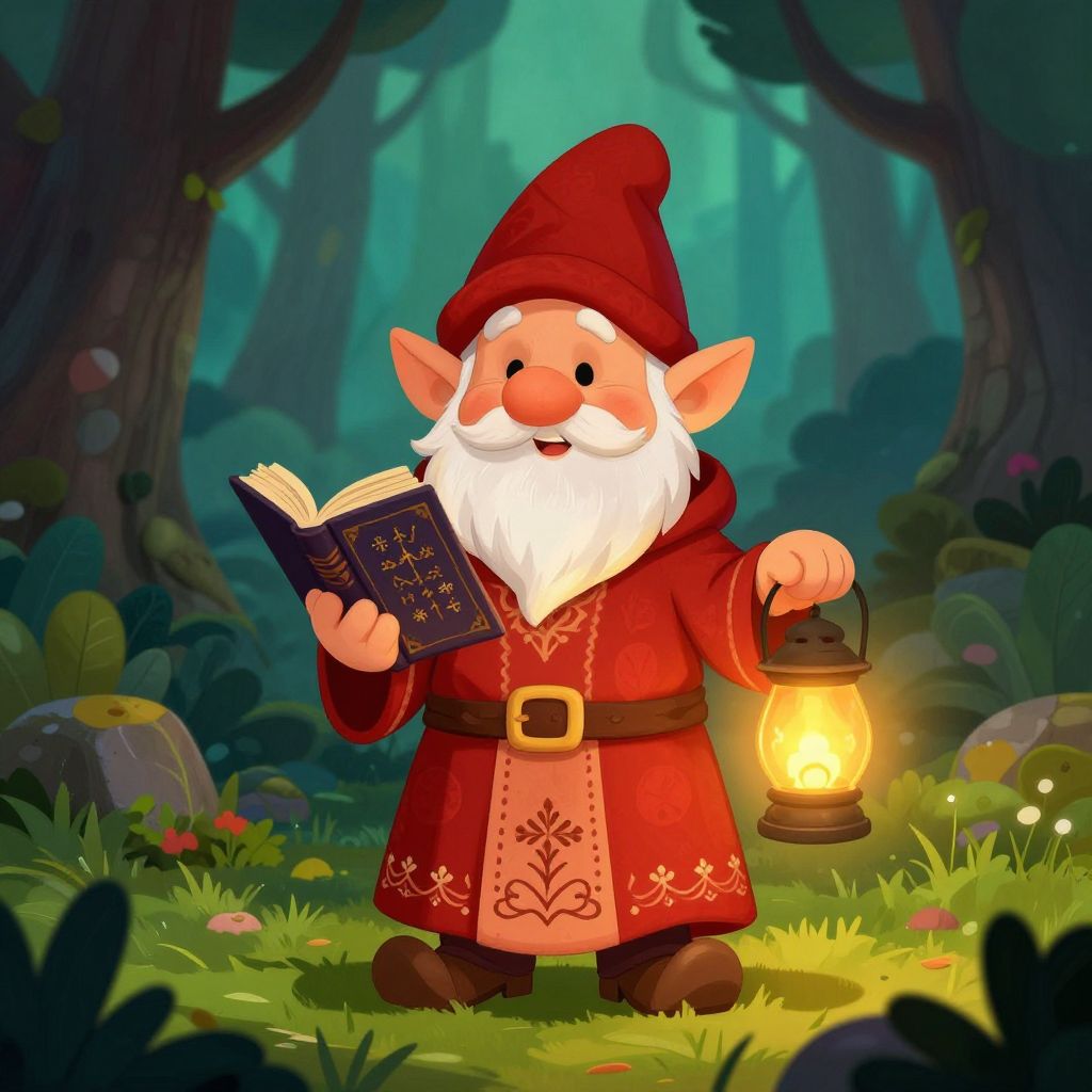 Gnome cleric DnD, whimsical small gnome character wearing embroidered cleric robes, holding a book of spells and a lantern, set in a lush enchanted forest clearing, vivid colors