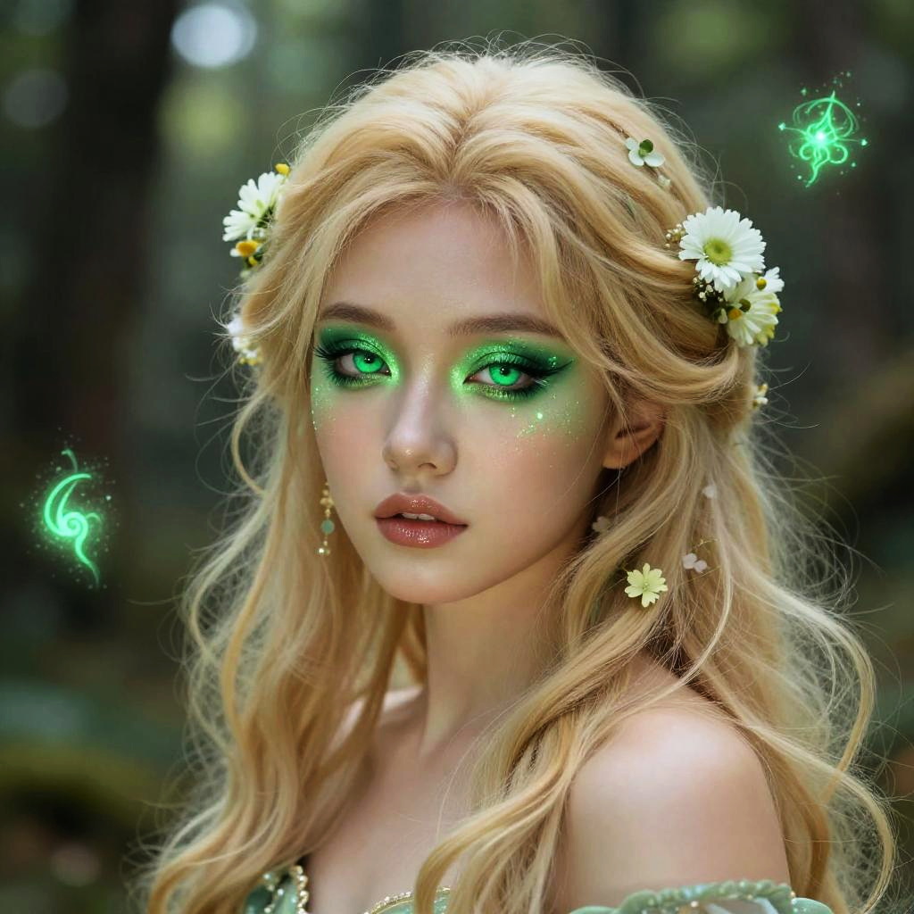 Blonde hair green eyes makeup fantasy character in a mystical forest, glowing green eyes enhanced by shimmering emerald eye shadow, long flowing blonde hair adorned with tiny flowers, glowing magical runes floating around, ultra-detailed and dreamy atmosphere.