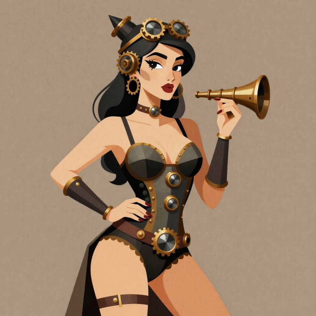 Woman with pretty face and pretty hair. Corset-inspired steampunk outfit, structured ivory lace corset, delicate floral embroidery, flowing emerald green tulle skirt, asymmetrical hemline, layered petticoats, knee-high Victorian boots, dark green velvet gloves, brass goggles, intricate clockwork jewelry, leather belt with pouches. --sref 1461
