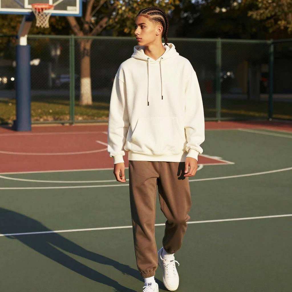 Fishtail Braids hairstyle on teenage boy, wearing hoodie and joggers, in basketball court, captured in fashion editorial style with late afternoon shadows.