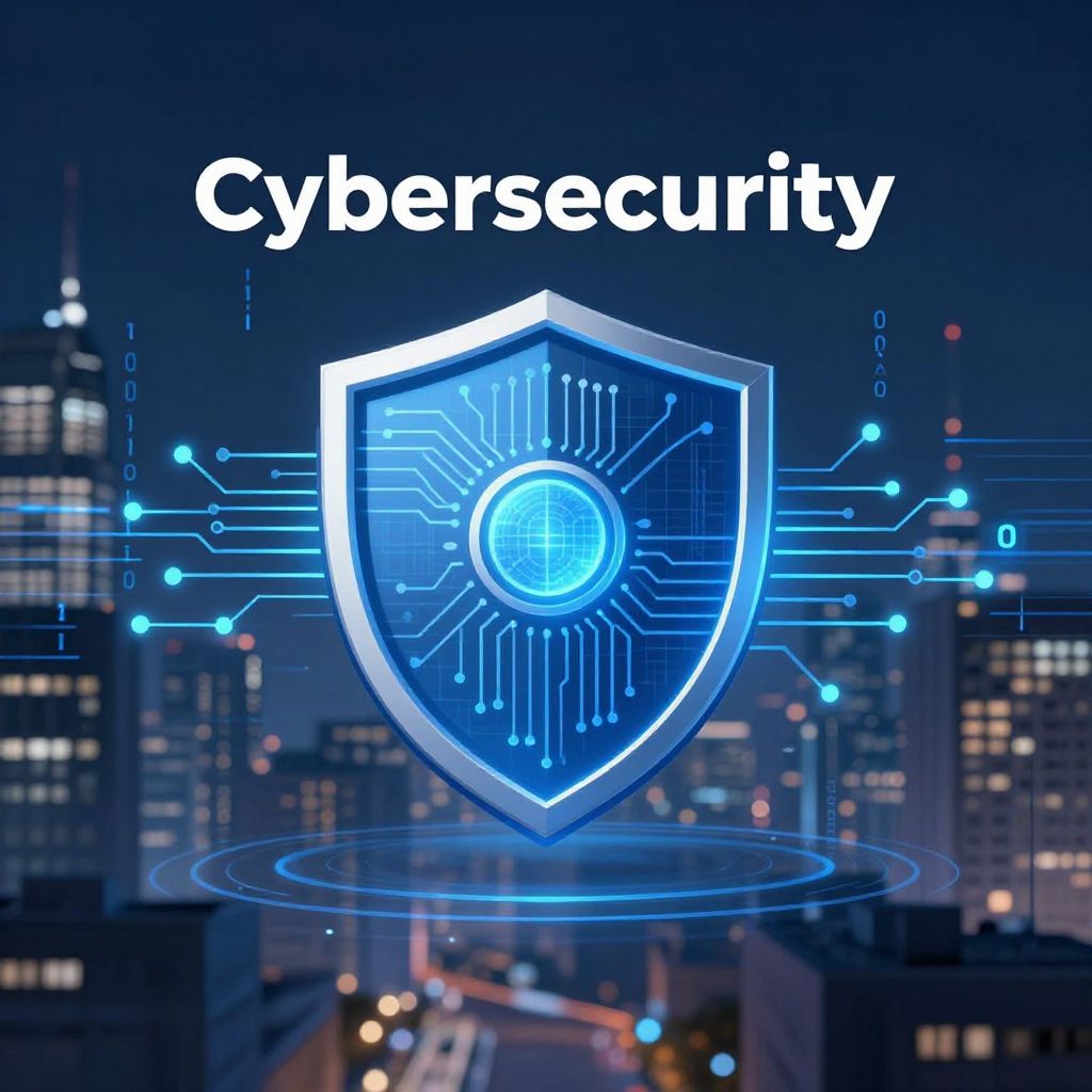 Cybersecurity LinkedIn banner featuring a sleek modern digital shield icon, glowing blue circuit patterns, futuristic cityscape in the background, with abstract binary code streams, high-tech vibe, professional and clean layout suitable for tech industry.