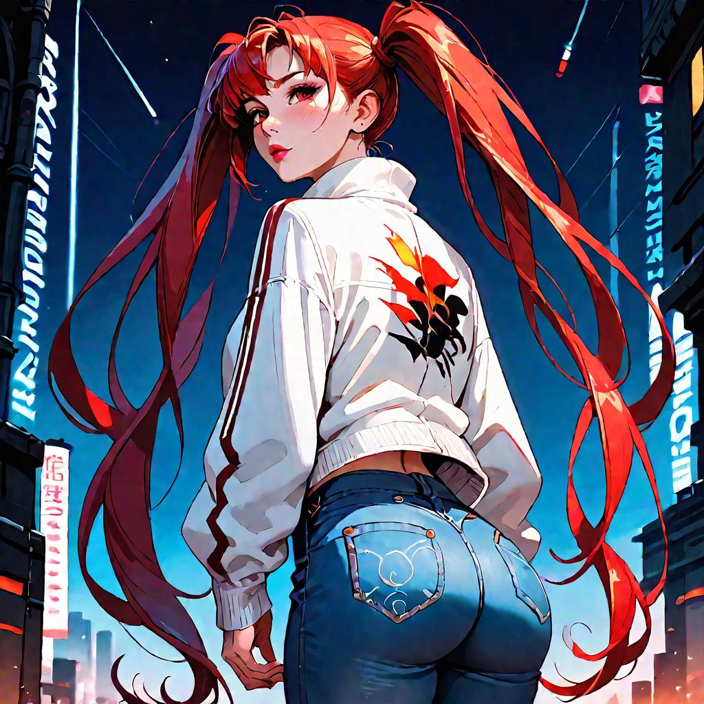 Digital anime-style illustration of a red-haired woman in a white uniform, holding a burger, standing in a brightly lit kitchen.
