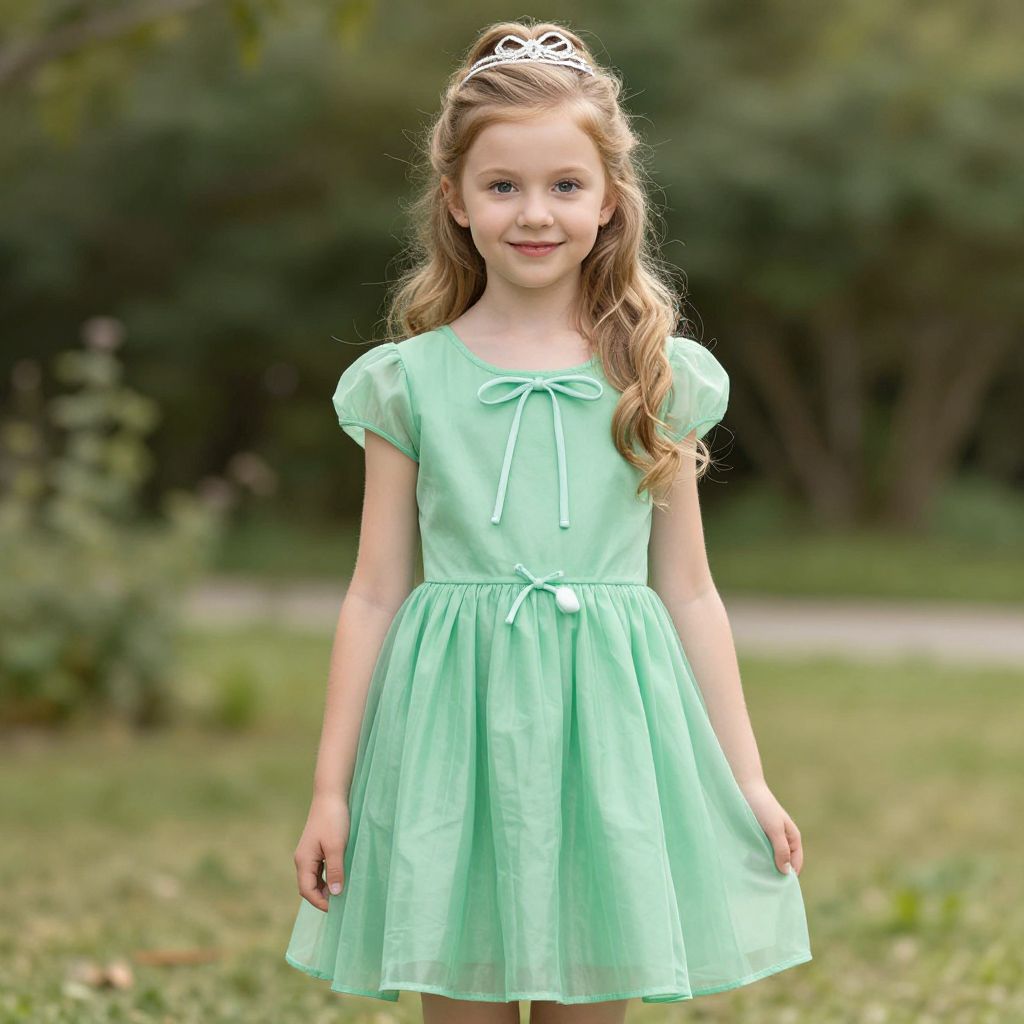 Photograph of a young Caucasian girl with light blonde, wavy hair, wearing a small silver tiara. She is dressed in a mint green, short-sleeved, knee-length dress with a bow at the center of the chest and a gathered waist. She stands outdoors on a grassy area with a blurred background of green trees and foliage. The girl smiles gently at the camera, with her hands resting by her sides. The dress has a soft, flowing texture, and the light filters through the trees, casting a natural, serene ambiance.