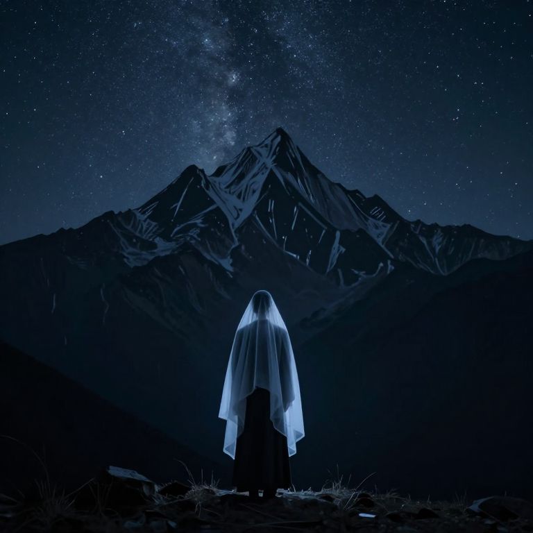 Under the veil of starlit skies, a solitary figure stands before a spectral mountain, its jagged peaks etched from forgotten dreams, embodying the quiet solitude of existential longing and the haunting beauty of memories too perilous to recall.