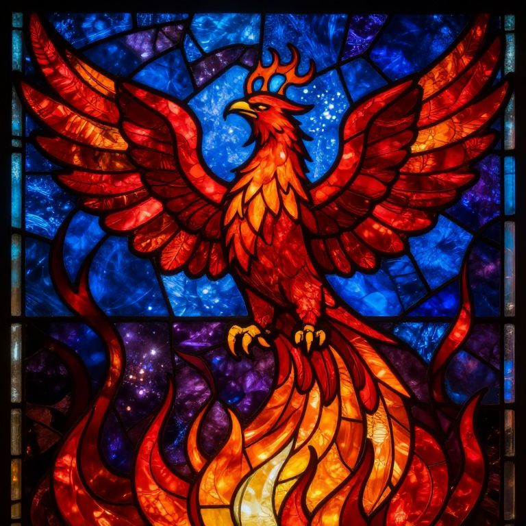 Vibrant stained glass depiction of a fiery red phoenix with outstretched wings, set against a blue and purple cosmic background.