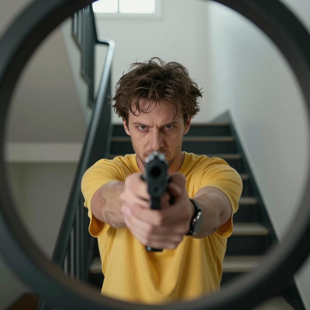 Photograph of a man with messy brown hair, yellow shirt, holding a gun, seen through a circular lens. Intense expression. Background: dimly lit stairway with black and white walls, metal railing. Man centered, gun pointed forward.