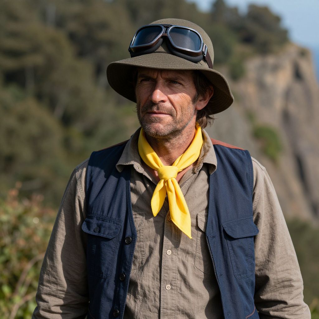 A man with a rugged, weathered face and short, messy brown hair stands in a sunlit outdoor setting. He wears a brown cotton shirt with a slightly wrinkled collar, paired with a navy blue vest that adds a touch of contrast and depth to his outfit. A vibrant yellow scarf is wrapped around his neck, fluttering gently in the breeze. He is wearing a wide-brimmed, olive-green hat that shades his face, with a pair of sleek, dark brown goggles perched securely on top of the hat, giving him a distinctive, adventurous look. His posture is upright and confident, as if he's mid-exploration or a moment of quiet reflection in a natural landscape, like a forest trail or a coastal cliffside.