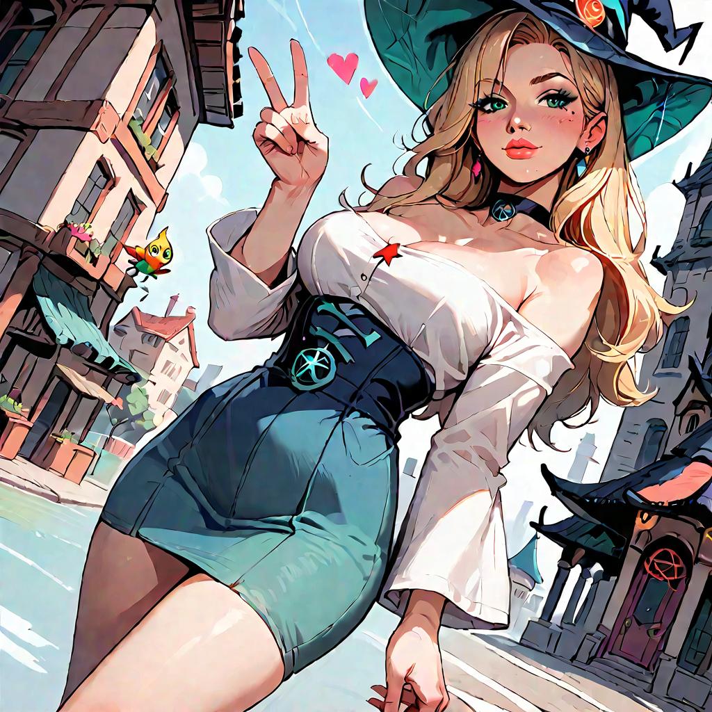 Digital artwork of a blonde woman with long, wavy hair wearing a large, teal witch hat, white off-shoulder blouse, and high-waisted blue skirt with a black belt featuring a pentagram. She is making a peace sign with her right hand, smiling, and has pink heart symbols above her head. Her makeup is bold, with red lipstick and dark eyeliner. The background shows a quaint, sunlit street with colorful buildings and a small yellow bird flying. The style is vibrant and anime-inspired with bold lines and bright colors.