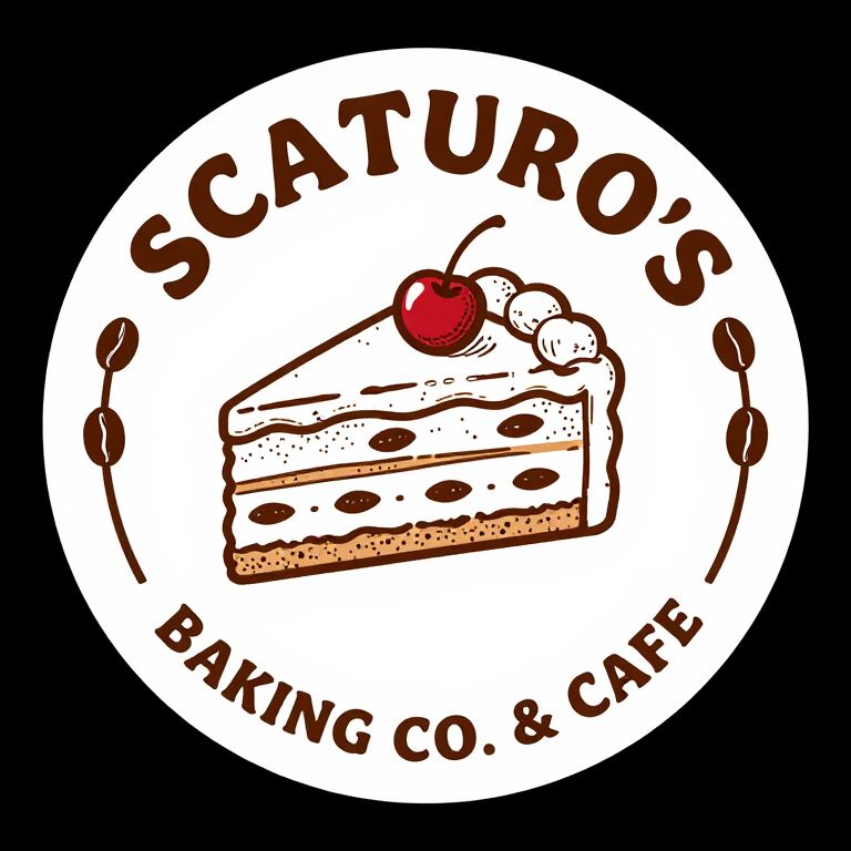 Scaturo's Baking Co. & Cafe logo features a vintage-inspired, hand-drawn illustration of a layered cake with a cherry on top, encircled by a coffee bean chain and bold typography, evoking a classic and artisanal aesthetic.