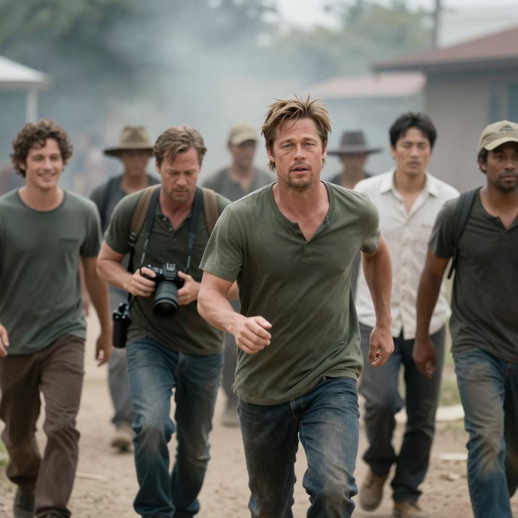 Photograph of a group of men in a chaotic outdoor scene. Central figure, Brad Pitt, with dark hair, green shirt, and intense expression, runs forward. Another man, middle, with light brown hair, camera in hand, also runs. Smoky background. Several men in green shirts and hats surround them. One man in white shirt, dark hair, looks forward. Smiling man with curly hair on left. Smoky, tense atmosphere. Trees and buildings in background.