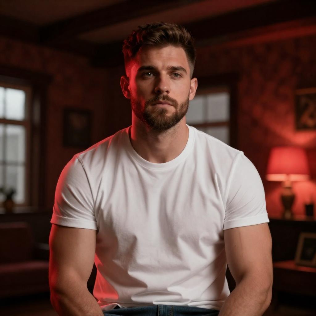 Muscular Man Clenching Fists in Dimly Lit Bar