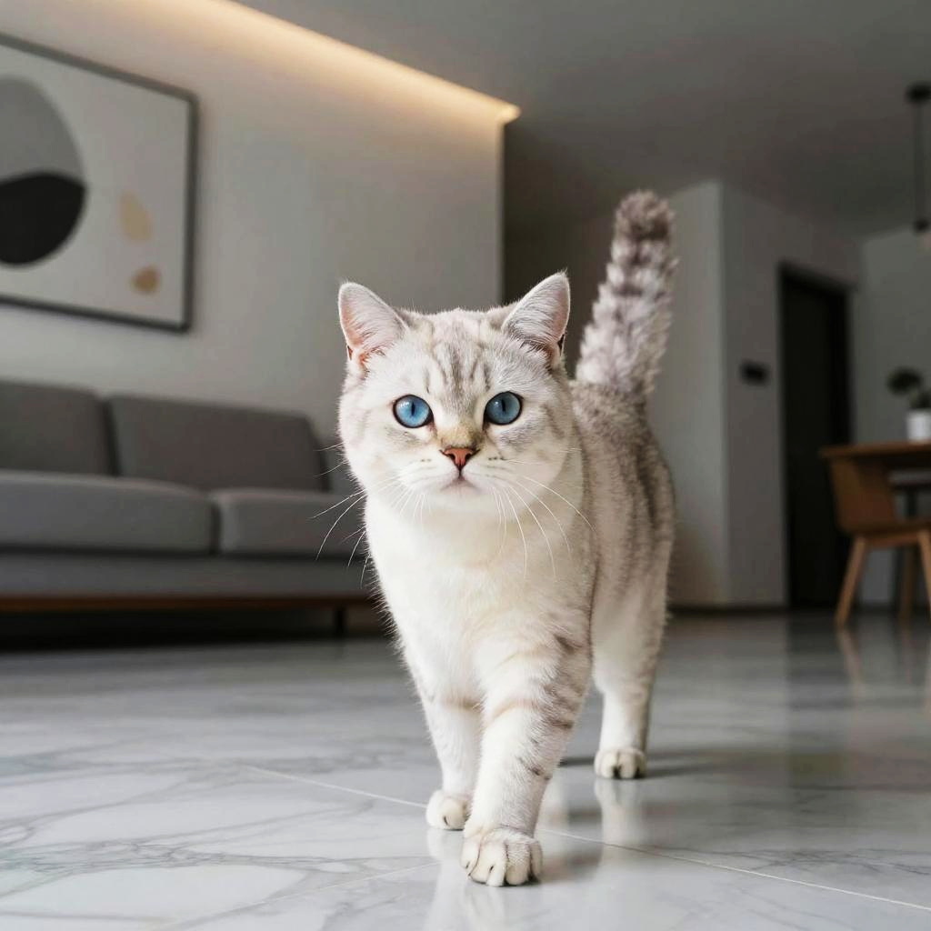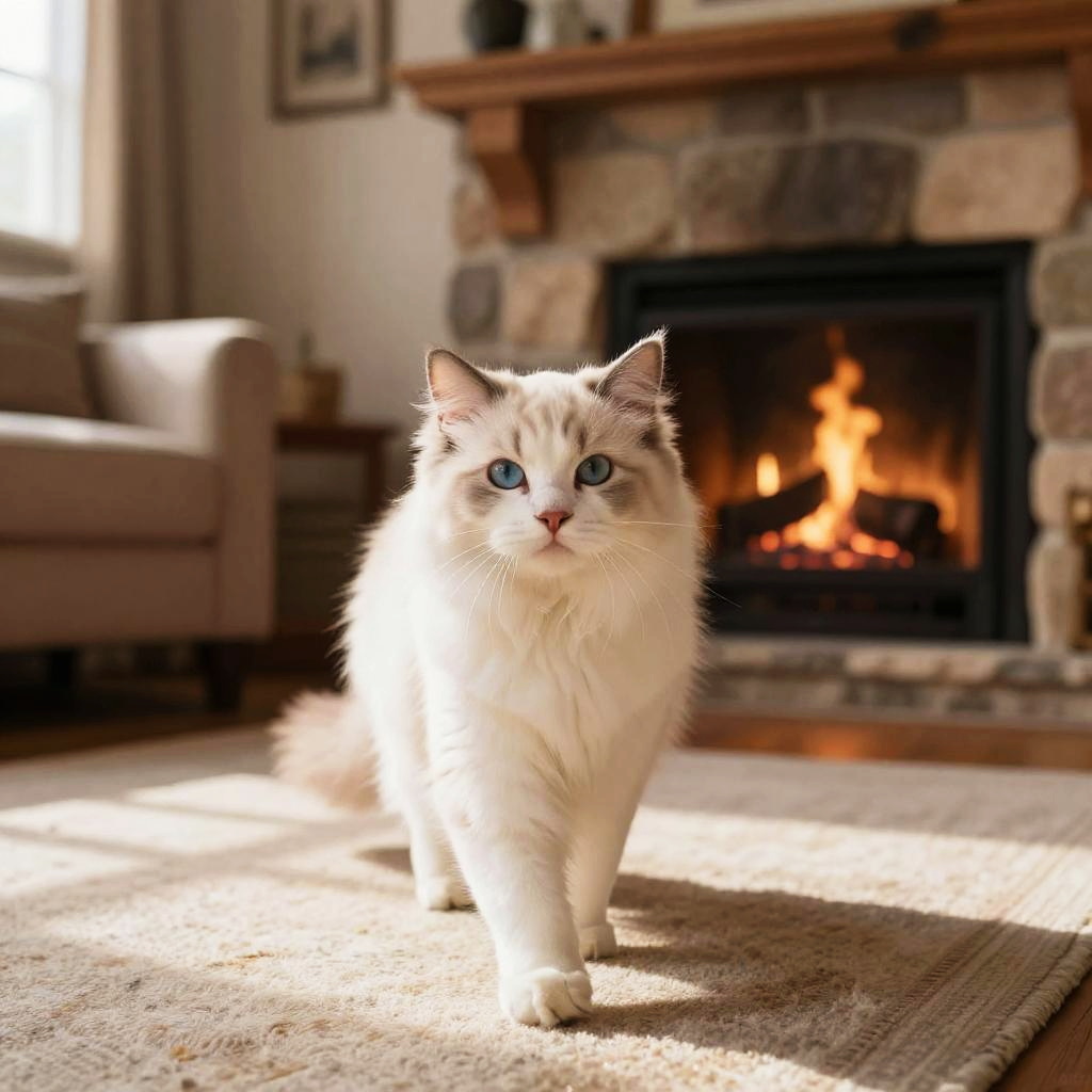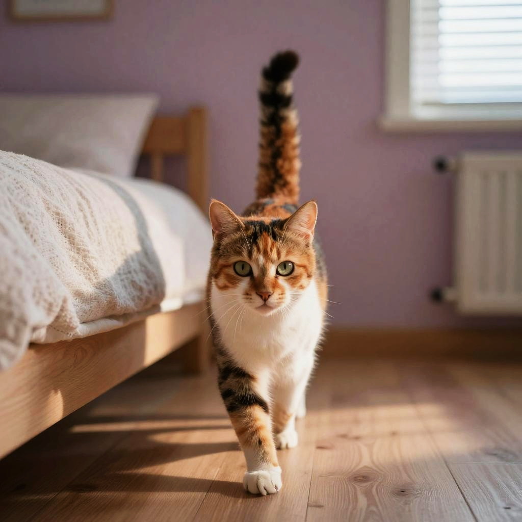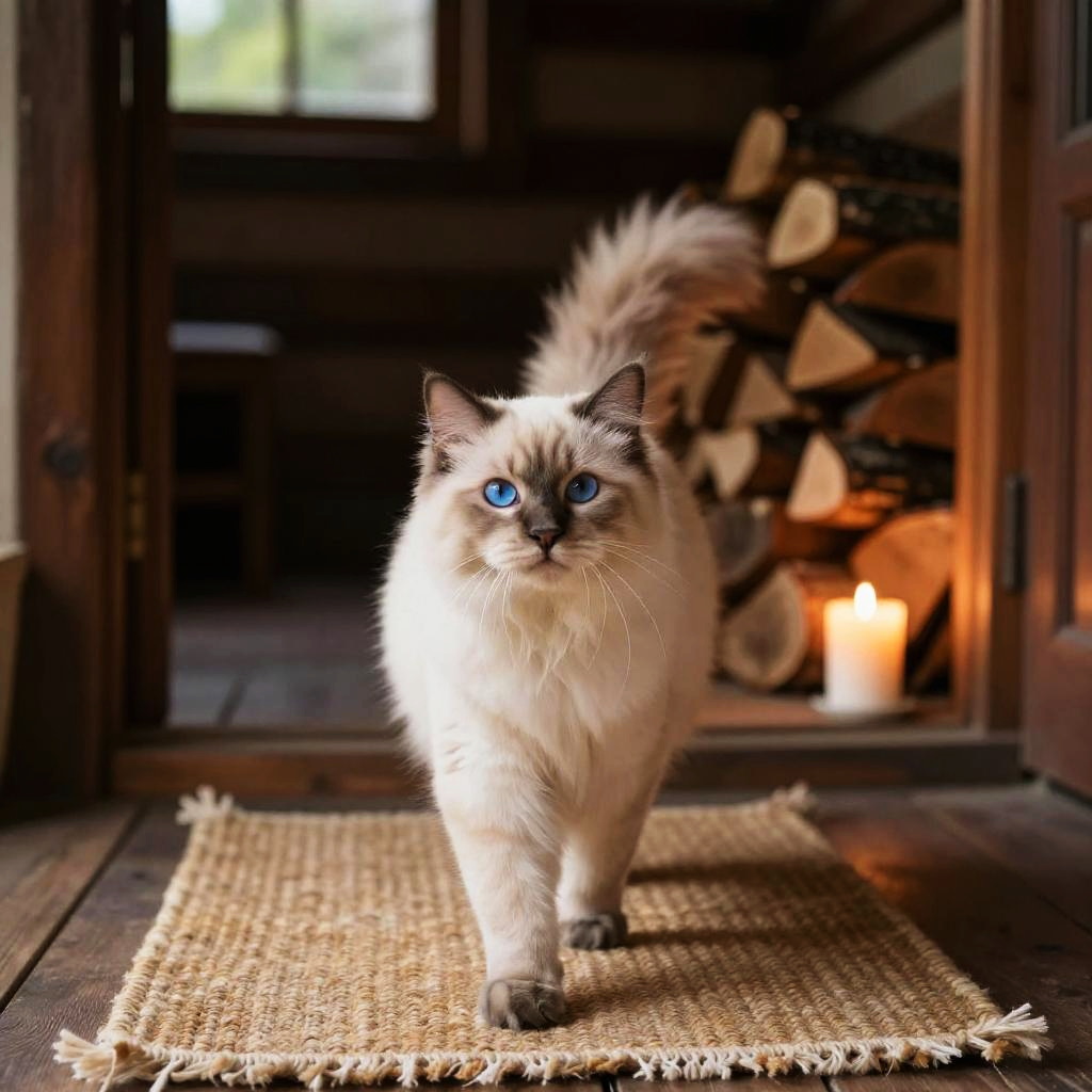 Elegant cinnamon Abyssinian cat with alert amber eyes confidently walking toward the viewer across stylish bohemian living room with colorful pillows and woven rugs, lit by late afternoon warm light creating contrasting shadows. Natural textures of fur, fabric, and wood emphasized; inviting and homey atmosphere; shallow depth of field; crisp whiskers; soft vignetting; balanced composition; subtle film grain; realistic color rendering; gentle contrast; fine detail throughout.