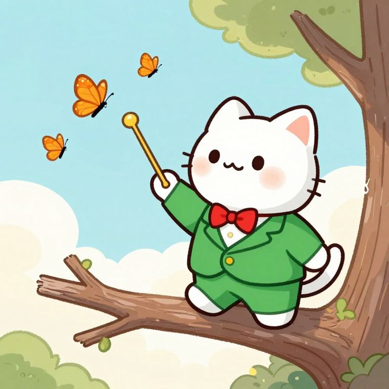 A whimsical cartoon-style illustration depicts a charming white cat adorned in a green suit and red bow tie, perched on a weathered tree branch, conducting an imaginary orchestra of orange butterflies with a golden baton, set against a serene sky with soft clouds.