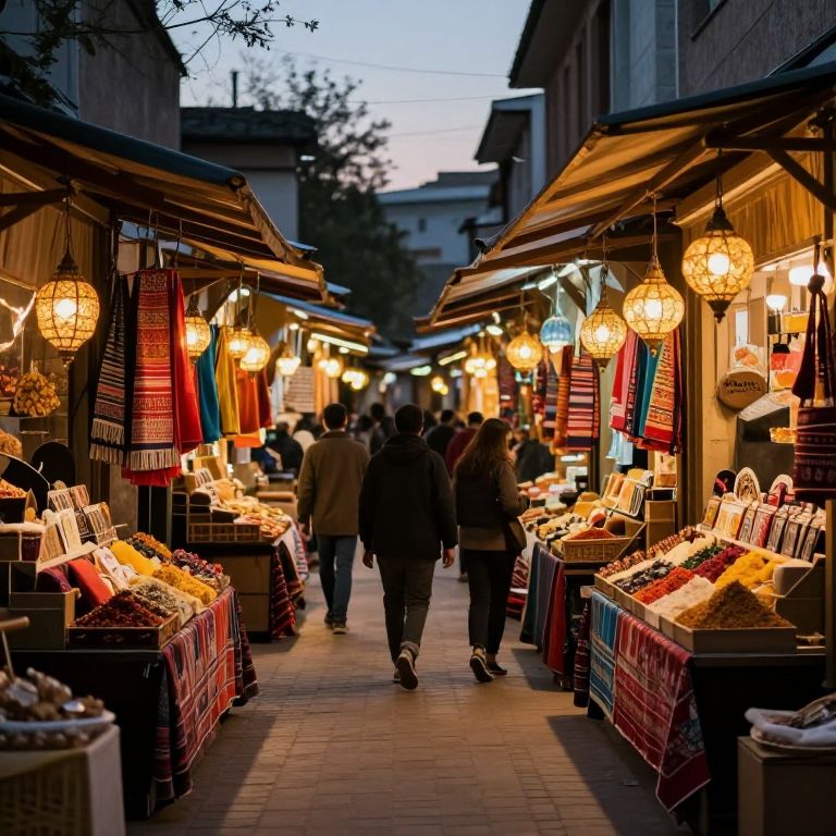 Ambiente scene in a bustling open-air market at dusk, warm glowing lanterns hanging from above, cozy small shops with colorful fabrics and aromatic spices, soft ambient lighting creating a welcoming atmosphere, detailed textures and lively crowd.