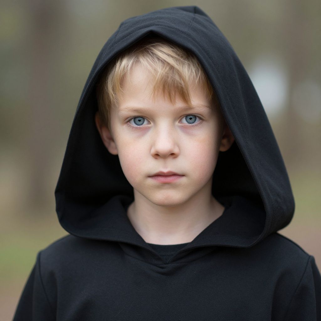 Photograph of a young boy with blue eyes, fair skin, and blond hair, wearing a black hoodie with the hood up, in a blurred outdoor