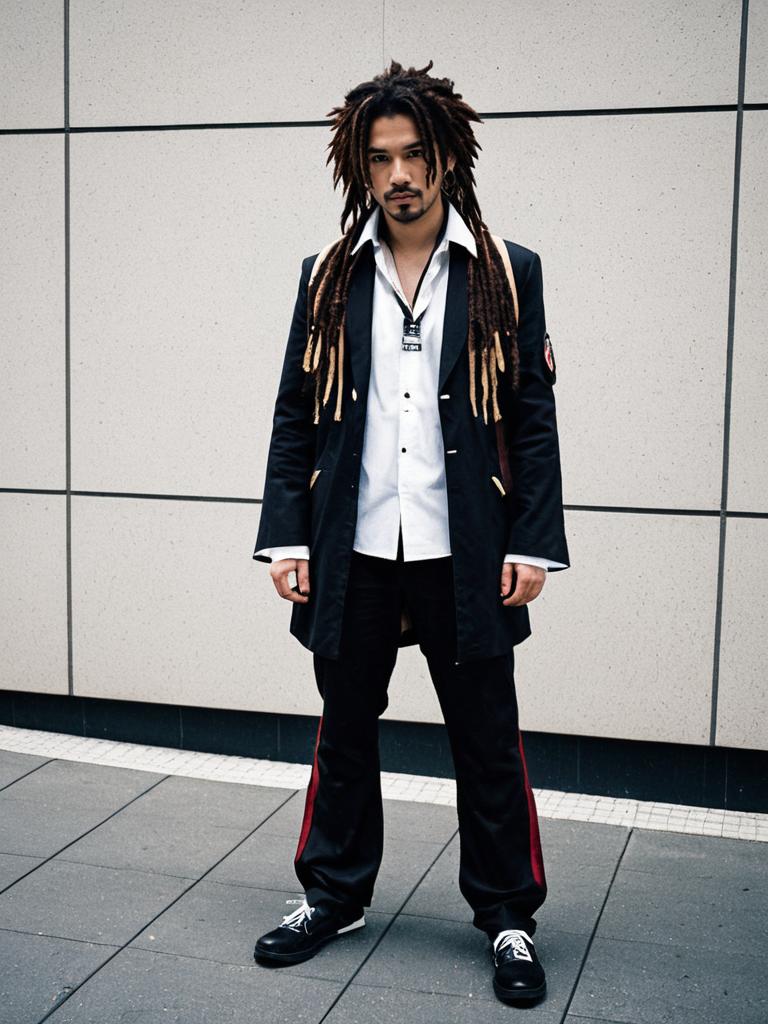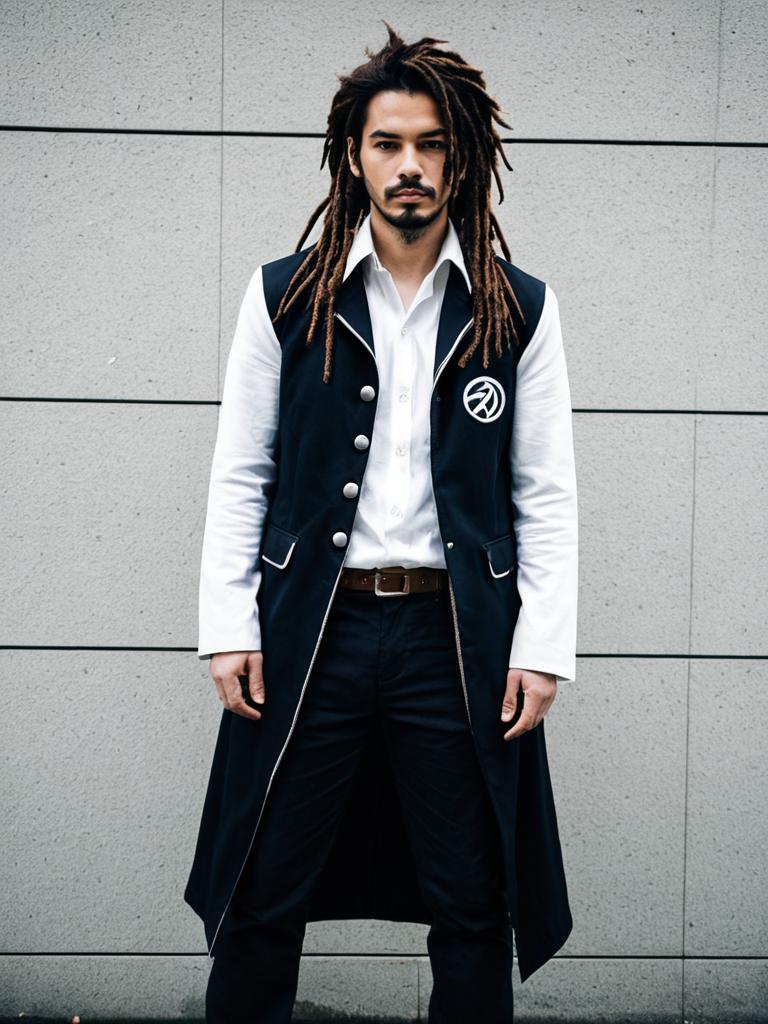 Photo-realistic cosplay photo of person in hagakure yasuhiro costume. Full body. Standing. Full length. 1boy, brown eyes, long hair, brown hair, jacket on shoulders, black jacket, white shirt, collared shirt, open jacket, dreadlocks, stubble