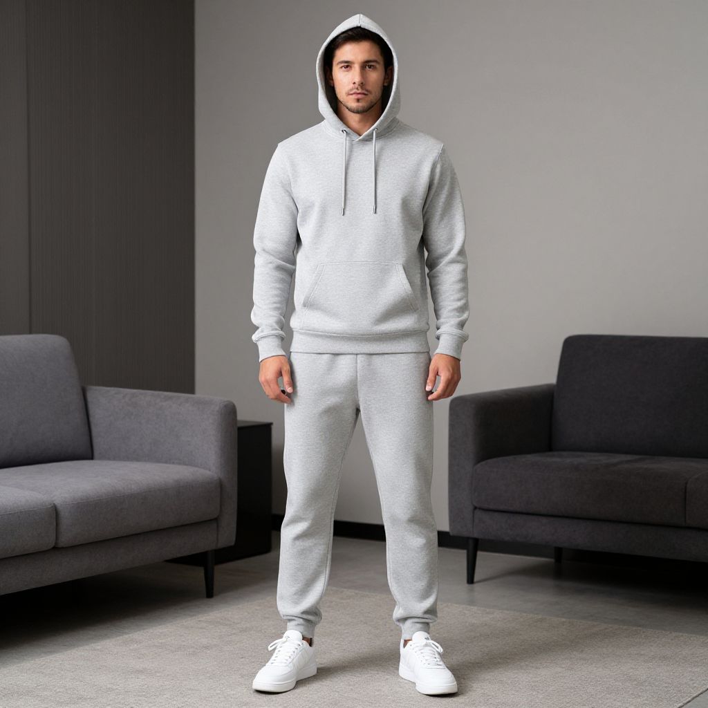 Sweat Suit Sets Costume, man in a grey hoodie and sweatpants standing in a room
