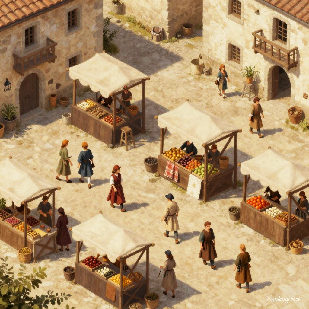 Vista isometrica of a bustling medieval market square, vendors selling fruits and fabrics, villagers in period costumes, wooden stalls, stone buildings, warm natural lighting, painterly style