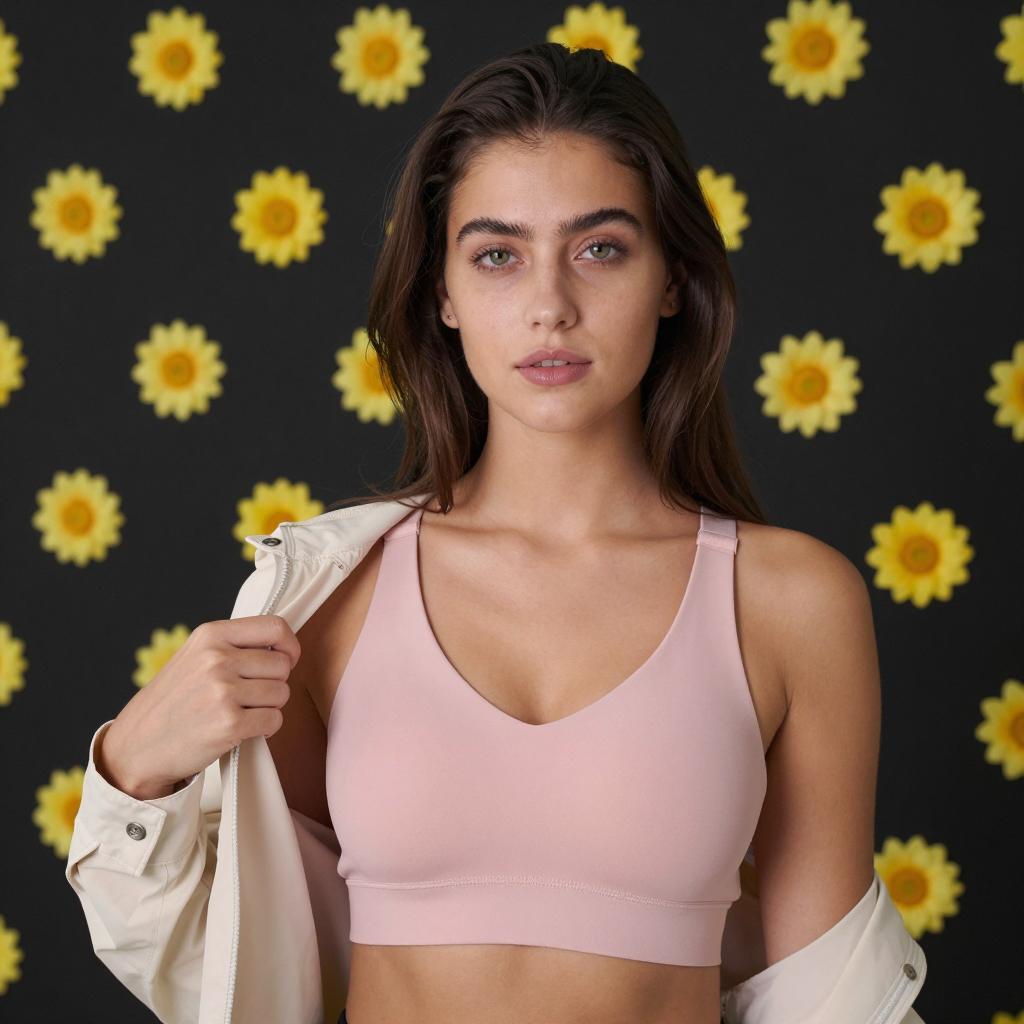 Photograph of a young woman with long dark brown hair, fair skin, and green eyes. She wears a light pink sports bra with a V-shaped center, slightly lifting her beige jacket. Background has yellow flowers against a black backdrop. Her expression is neutral with slightly parted lips. She has a slender build with small breasts. Her right hand holds the jacket's edge. She faces forward, head slightly tilted. The background flowers are evenly spaced, adding a floral pattern.