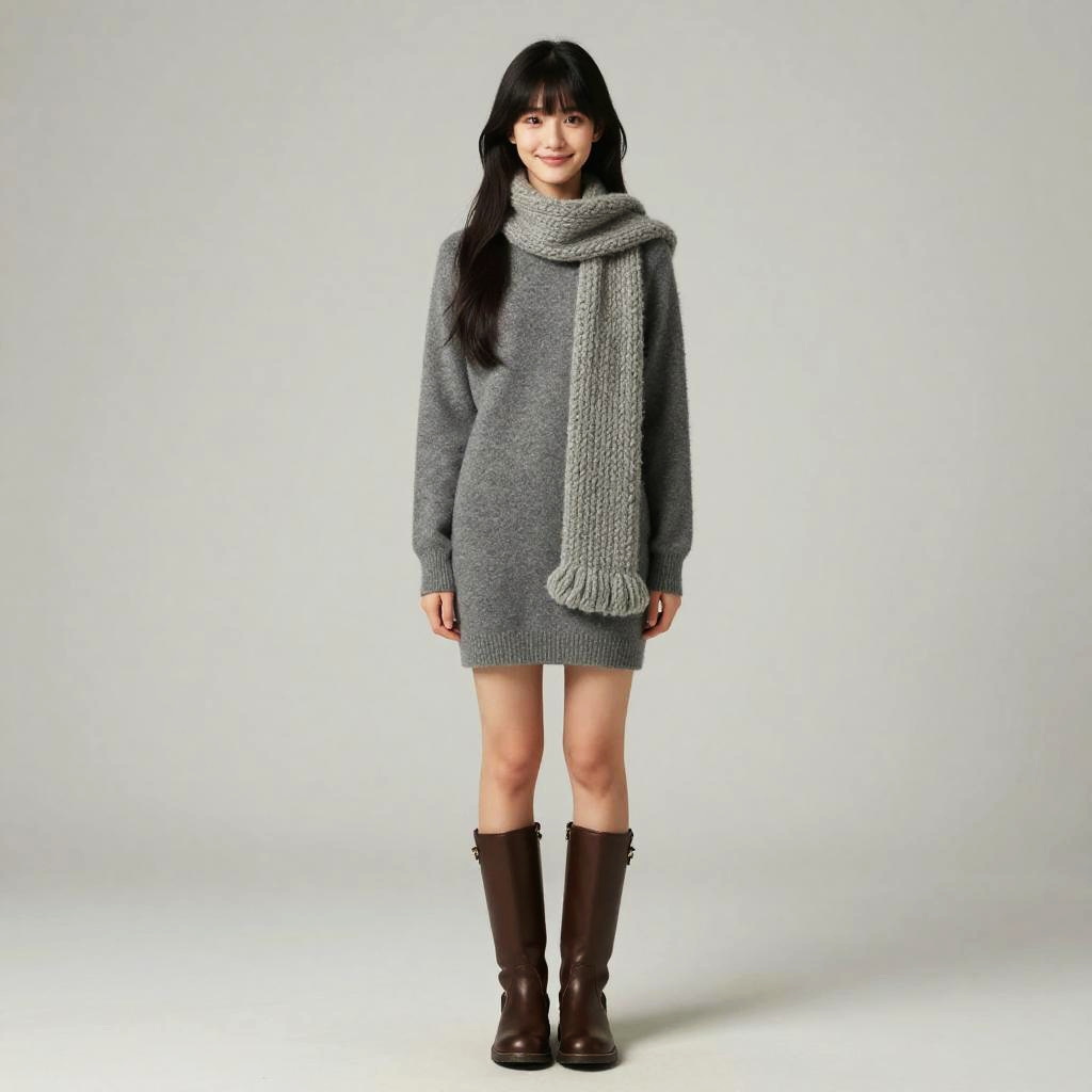 Best quality, masterpiece, realistic, photorealistic, 1girl, solo, looking at viewer, light smile, full body, standing, long hair, black hair, bangs, cyb skirt, capelet, long sleeves, wool ball scarf, scarf, brown boots, simple background