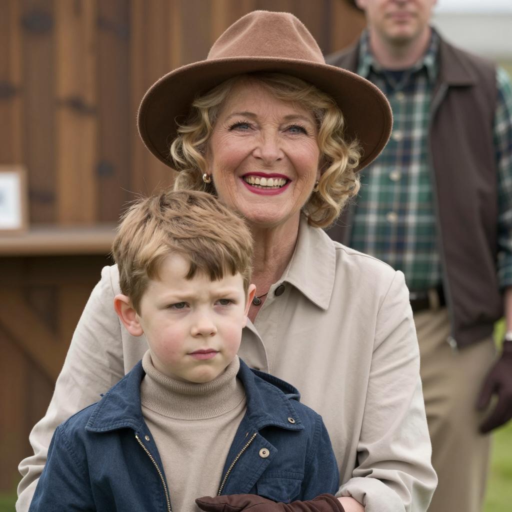 Photograph of four people outdoors. Center: elderly woman with gray hair, beige dress, laughing, leaning forward. Right: middle-aged man with long brown hair, brown coat, white shirt, laughing. Bottom: young boy with brown hair, black coat, head down, being lifted. Left: older man with black hat, brown coat, white cravat, standing. Background: green trees.