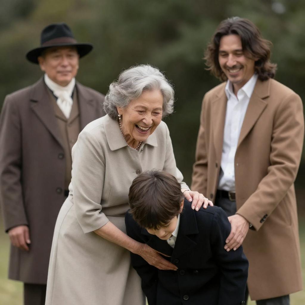 A joyful multigenerational family group outdoors with an elderly woman with gray hair in a beige dress laughing while leaning forward, a middle-aged man with long brown hair wearing a brown coat and white shirt smiling, a young boy in a black coat with head down being gently held, and an older man in a black hat and brown coat with white cravat standing in the background. The setting is a natural green area with trees in the background.