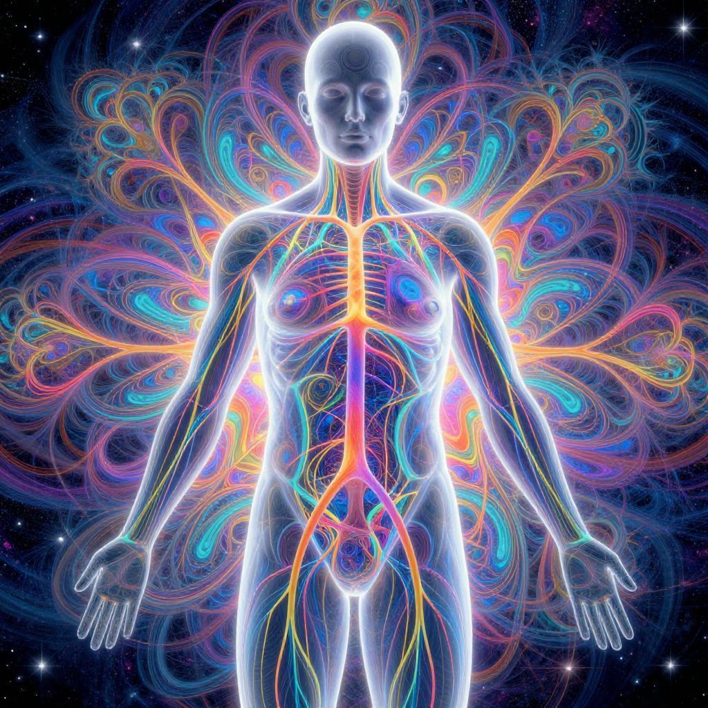 Intricate Alex Gray psychedelic art illustration showing a transparent human form revealing intricate neural networks and energetic pathways, vivid psychedelic colors radiating outward in fractal patterns with a surreal cosmic atmosphere.