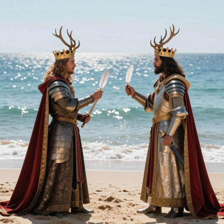 Two regal figures clad in opulent armor and crowns adorned with antlers stand poised on a beach, holding quill pens instead of swords, as if engaged in a duel of words rather than battle, against the backdrop of a shimmering sea that seems to merge with the horizon in a surreal, otherworldly tableau.