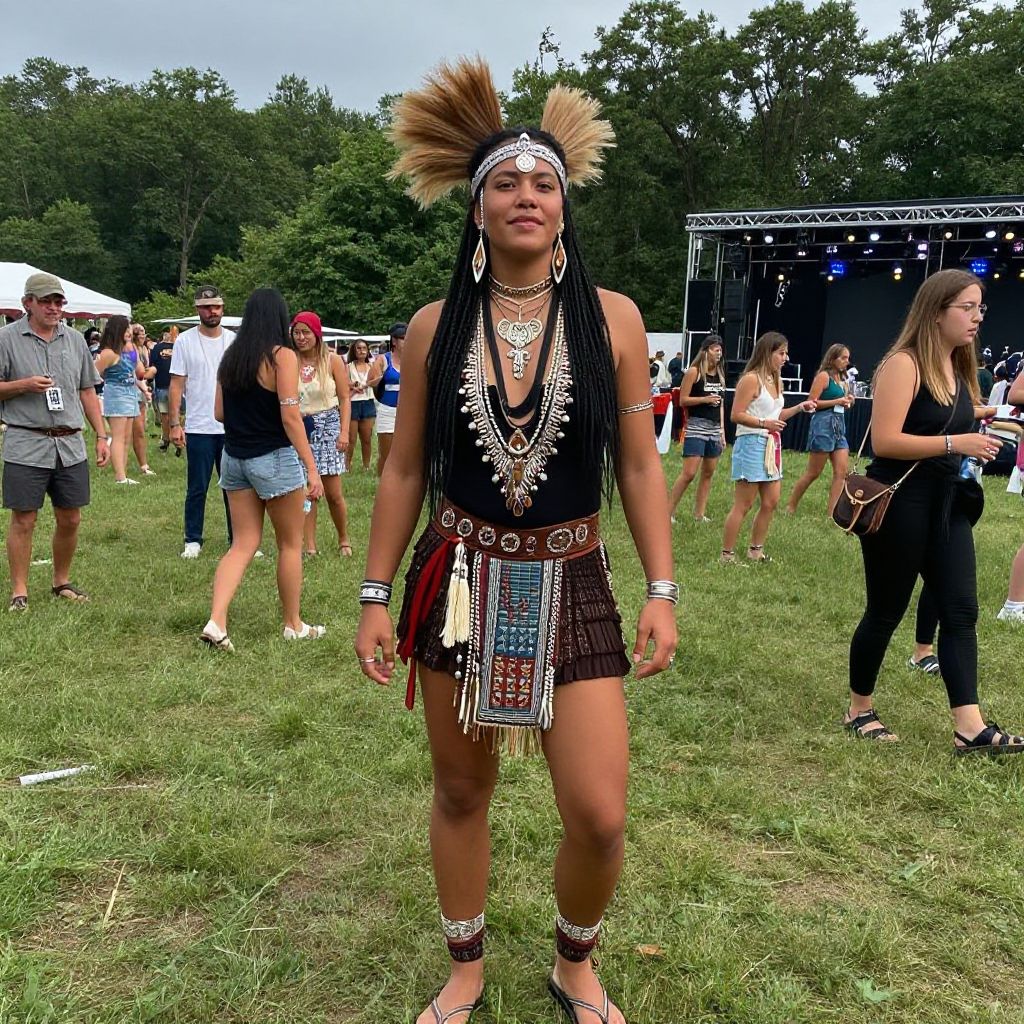Photograph of a young indigenous woman standing in a grassy outdoor area. She has a medium brown skin tone, long dark hair, and wears a large, decorative headdress with brown and white feathers. She is dressed in a black sleeveless top adorned with white beadwork, a multi-patterned, fringed skirt with a brown and white waistband, and silver ankle bracelets. She also wears multiple necklaces with white and silver beads. In the background, there are several people, including women in casual summer clothing and a man in a grey shirt and shorts. A stage with blue lights and a white canopy are visible to the right. Trees line the background under a partly cloudy sky.