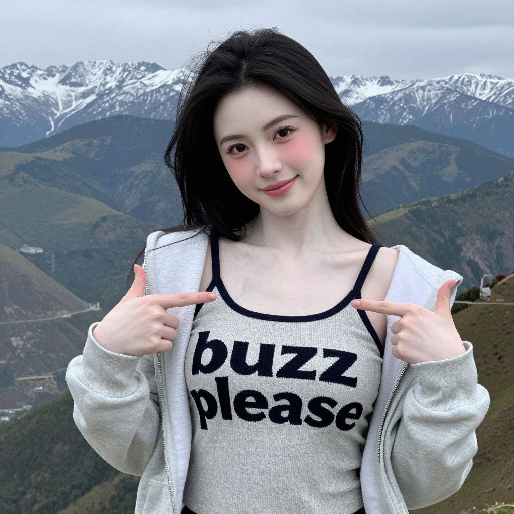 A beautiful woman wearing a knit tank top with the bigtext \"buzz please\" written on it, Open hoodie, She has long black hair, marble-white skin, Blushing, She is smiling and looking at the camera playfully, Pointing with both her hands to her shirt, Standing on a hill with a background of snow mountains and valleys